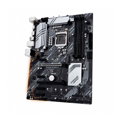La carte mère ASUS 1200 PRIME Z490-P Intel® Z490 (LGA 1200) ATX motherboard with dual M.2, 11 DrMOS power stages, 1 Gb Ethernet, HDMI, DisplayPort, SATA 6Gbps, USB 3.2 Gen 2, Thunderbolt™ 3 support, and Aura Sync RGB Lighting.