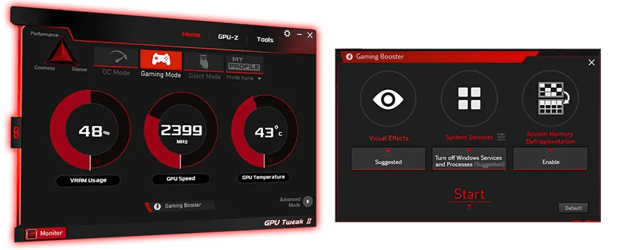 L’utilitaire ASUS GPU Tweak II fait passer le réglage de la carte graphique au niveau supérieur. Il vous permet de modifier les paramètres critiques, notamment les horloges de base du GPU, la fréquence de la mémoire et les paramètres de tension, avec la possibilité de tout surveiller en temps réel via un affichage personnalisable à l’écran. Un contrôle avancé des ventilateurs est également inclus, ainsi que de nombreuses autres fonctionnalités pour vous aider à tirer le meilleur parti de votre carte graphique.