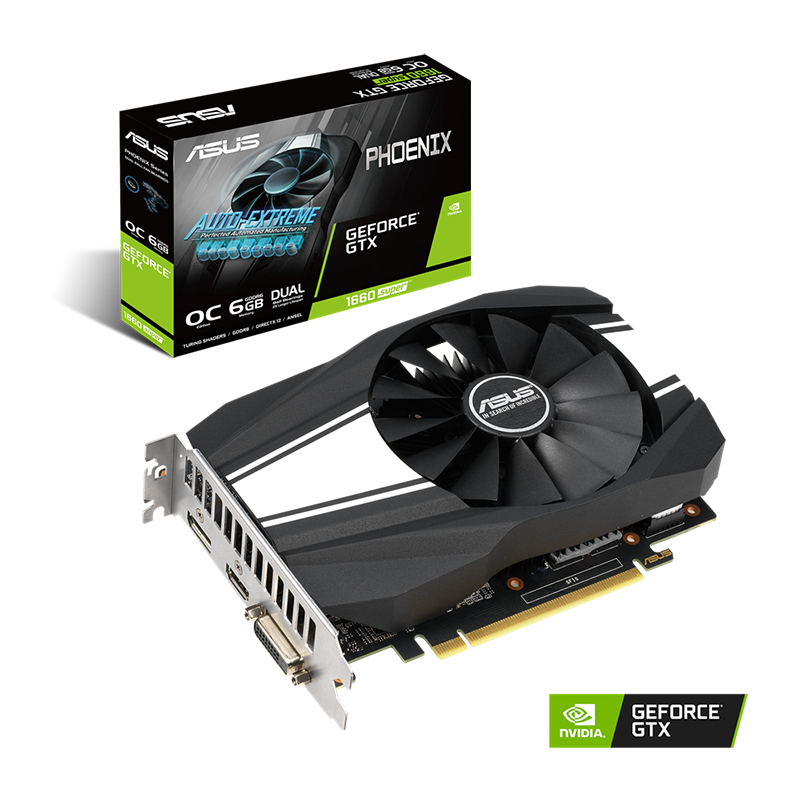 La ASUS Phoenix GeForce® GTX 1660 SUPER™ est une puissante carte graphique haute définition au format compacté. Elle présente un seul grand ventilateur avec des pales recourbées héritées des meilleurs cartes graphiques du marché. Cette caractéristique booste les performances de la carte tout en lui conférant un format compact compatible avec la majorité des châssis récents. À l’image de son nom, la Phoenix dispose d’une durée de vie prolongée notamment grâce à sa technologie Anti-Poussière certifiée IP5X, son ventilateur à double roulement à billes et sa technologie Auto-Extreme. Si vous êtes à la recherche d’une carte graphique flexible qui affichera correctement chaque pixel de vos visuels, la Phoenix est faite pour vous !