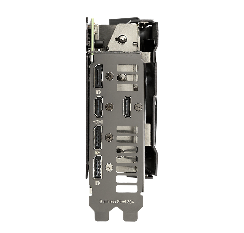 Le dessous de la carte révèle une foule d’améliorations. La majeure partie de l’arrière est enveloppée d’une plaque arrière protectrice en métal qui présente bien en évidence un large évent. L’évent permet à l’air chaud de s’échapper vers les ventilateurs d’extraction du châssis au lieu d’être recyclé dans le refroidisseur du GPU. L’acier inoxydable est utilisé pour le support d’E/S afin de protéger les ports et de fournir un montage plus sûr. Un commutateur Dual Bios idéalement placé permet la personnalisation du profil de performance par défaut de la carte sans logiciel.