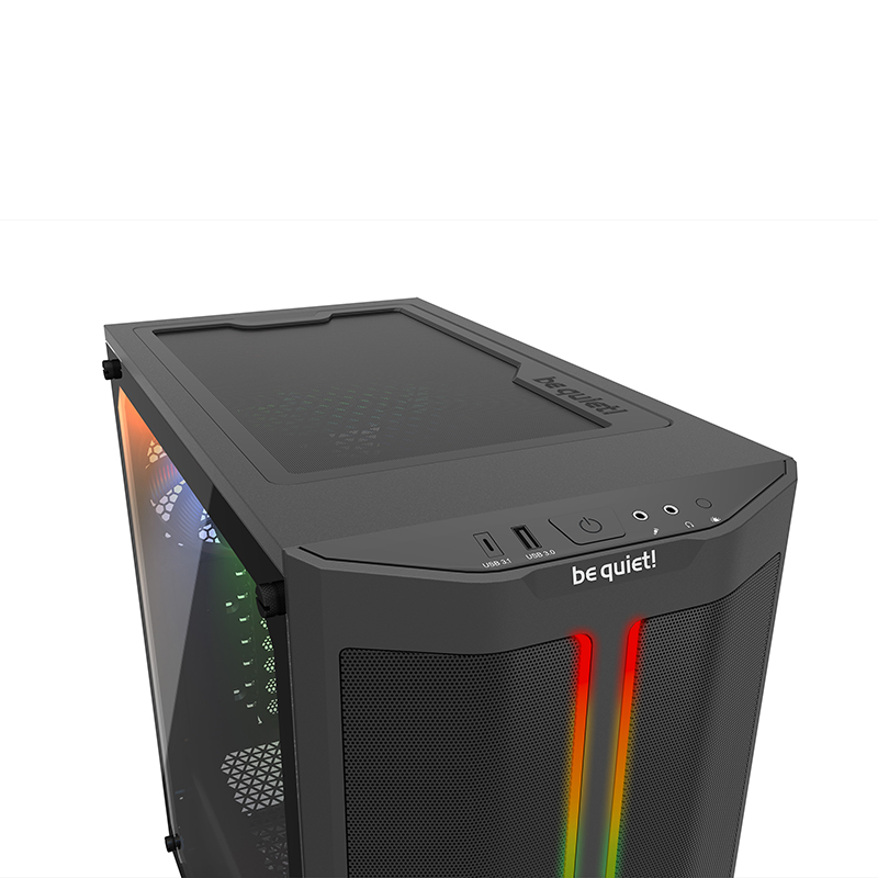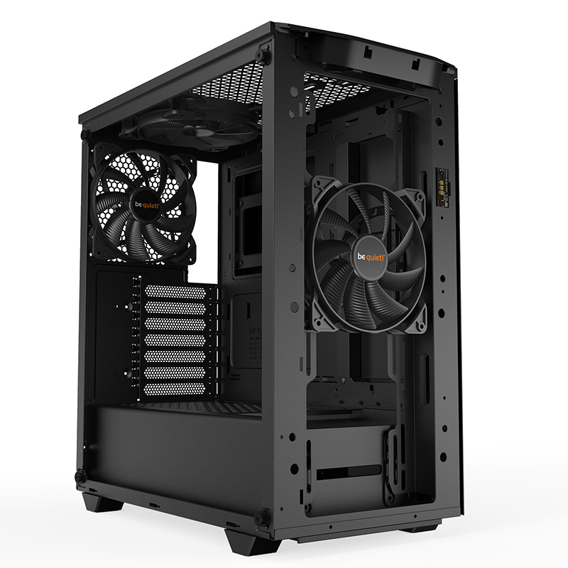 Trois ventilateurs Pure Wings 2 pré-installés avec des pales optimisées assurent un flux d’air idéal et un refroidissement constant. Malgré la conception compacte du boîtier, les ventilateurs avant, sur le dessus et à l’arrière sont des modèles en 140 mm, assurant un fonctionnement très silencieux. En option, deux autres ventilateurs 140 mm supplémentaires peuvent être installés.