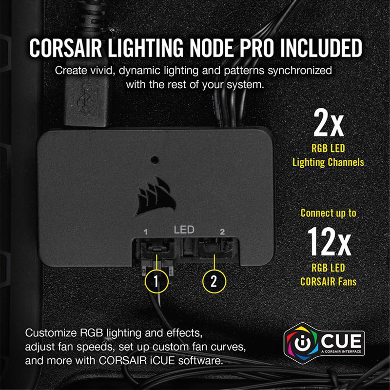 Contrôlez votre éclairage RGB via le logiciel CORSAIR iCUE avec le Lighting Node CORE* extrêmement compact, réduisant l’encombrement lié au câblage avec de simples connexions USB 2.0 et SATA.