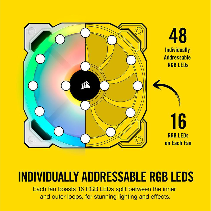 Quatre zones d’éclairage et 16 LED par ventilateur diffusent des couleurs envoûtantes et offrent des effets impressionnants sous tous les angles pour un éclairage spectaculaire, que les ventilateurs soient utilisés pour l’aspiration ou l’évacuation.