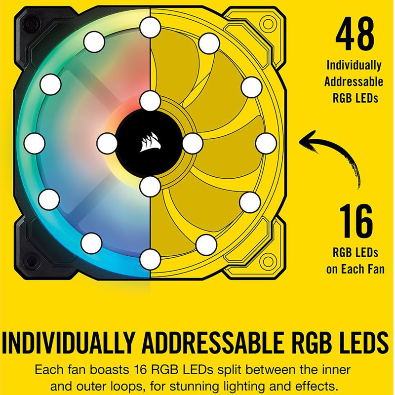Le ventilateur intelligent blanc PWM LED 120 mm CORSAIR LL120 RGB LED Black Edition est doté de 16 LED RGB adressables individuellement réparties sur deux boucles lumineuses distinctes dans un boîtier blanc saisissant, créant un éclairage et des effets visuels éclatants.
