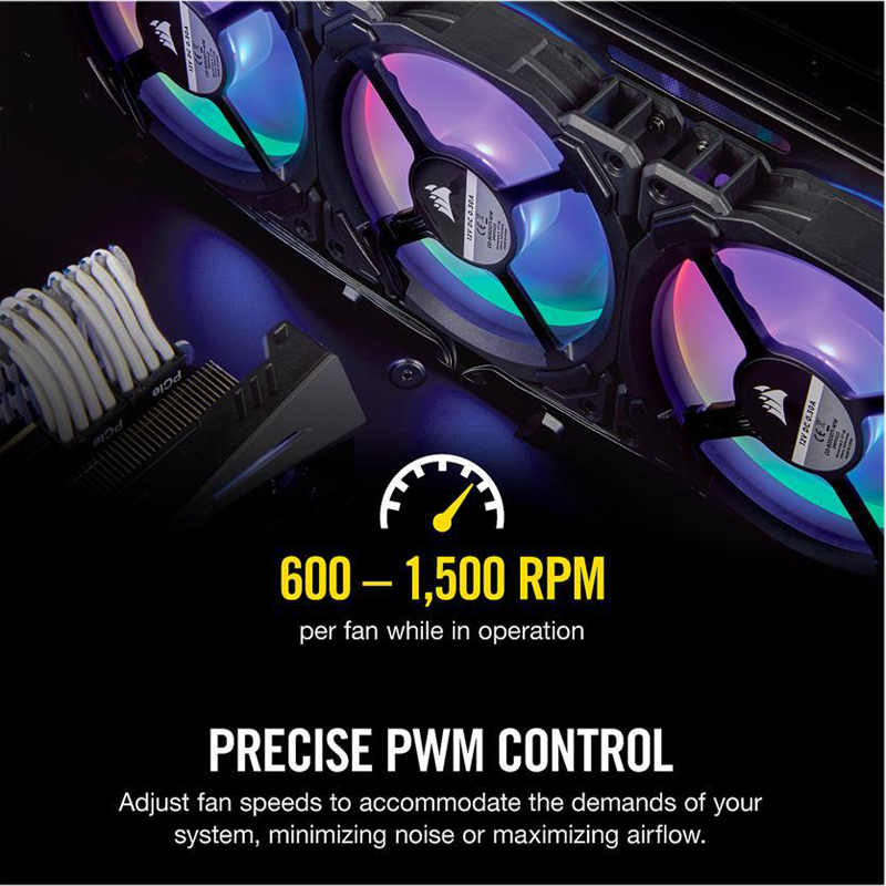Des vitesses de rotation puissantes associées à un contrôle PWM précis garantissent que les ventilateurs refroidissent rapidement et efficacement lorsque c’est nécessaire mais restent silencieux à bas régime.