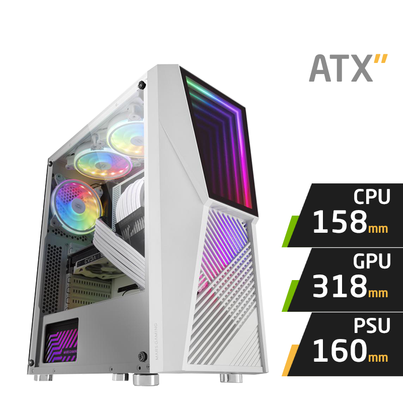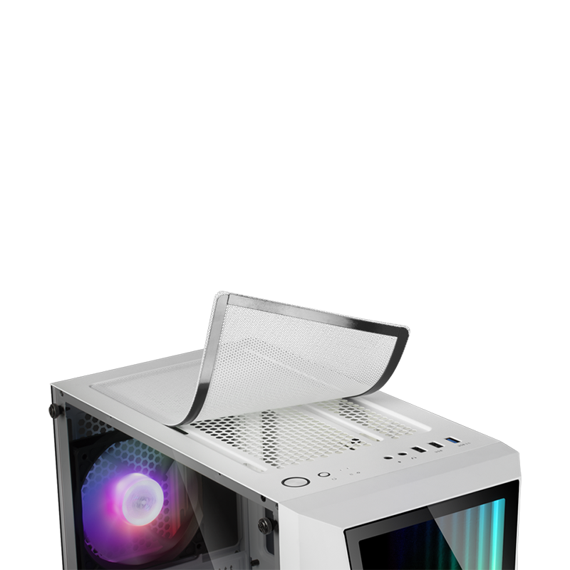 Laissez-vous envoûter par le boîtier MC777 Édition blanc , son INFINITE ARGB MIRROR tout en profitant d’un double refroidissement puissant en standard et de beaucoup d’espace pour tous vos composants.