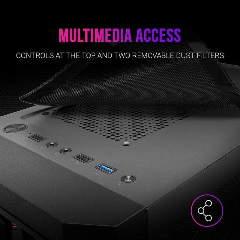 Boîtier compact RÉVOLUTIONNAIRE offrant le meilleur refroidissement possible grâce à sa technologie exclusive MESH 360º, avec des mailles métalliques sur la majeure partie de sa surface et trois ventilateurs de 120 mm préinstallés sur la façade pour un flux d’air inégalé. Conçu pour les tailles compactes MicroATX et Mini-ITX et avec un support complet pour le refroidissement liquide.