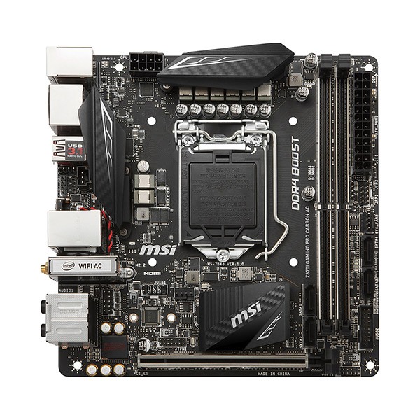 La carte mère MSI Z370I GAMING PRO CARBON AC prend en charge les derniers processeurs Intel Core de 8ème génération (Intel Coffee Lake) pour l’assemblage d’une configuration Gaming de haut vol. Basée sur le chipset Intel Z370 Express, cette carte mère bénéficie de la qualité de fabrication MSI.Carte mère Mini-ITX Socket 1151 Intel Z370 Express – 2x DDR4 – SATA 6Gb/s + M.2 – USB 3.1 – 1x PCI-Express 3.0 16x – LED RGB – WIFI AC / Bluetooth 4.2