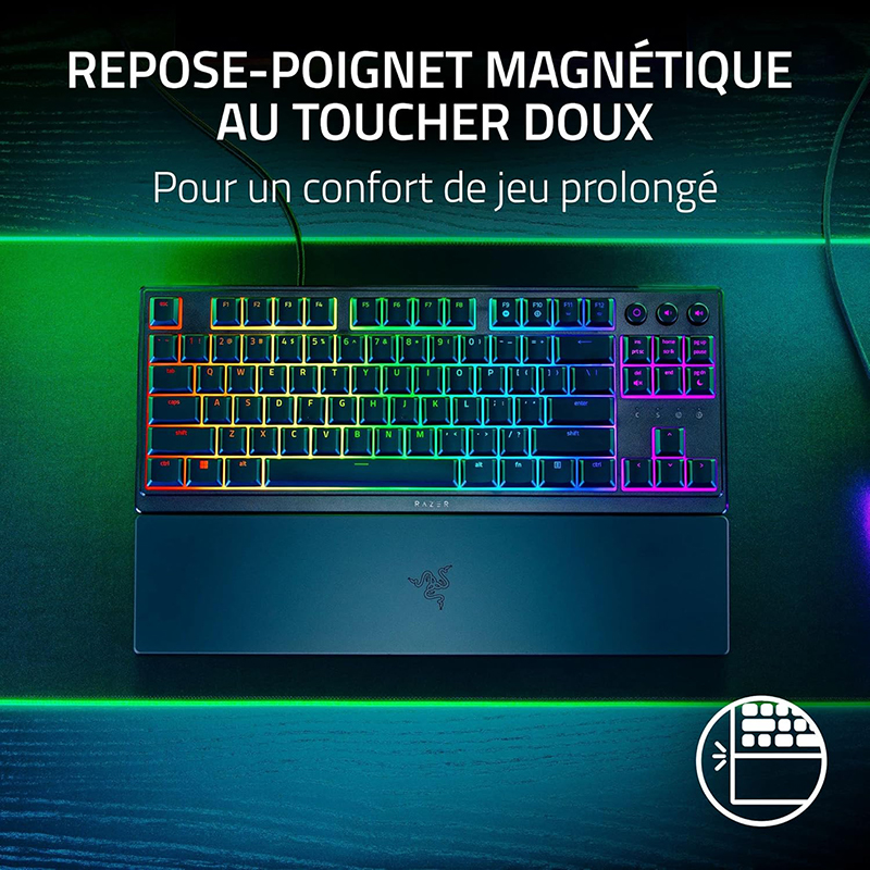 e Razer Ornata V3 Tenkeyless est un clavier gaming conçu pour allier confort, réactivité et compacité. Grâce à ses switches méca-membrane, il offre une sensation de frappe agréable et réactive, idéale pour les sessions de jeu prolongées et la saisie rapide. Son format tenkeyless (TKL), dépourvu de pavé numérique, permet un gain d’espace optimal sur le bureau et une meilleure ergonomie pour les mouvements de la souris.