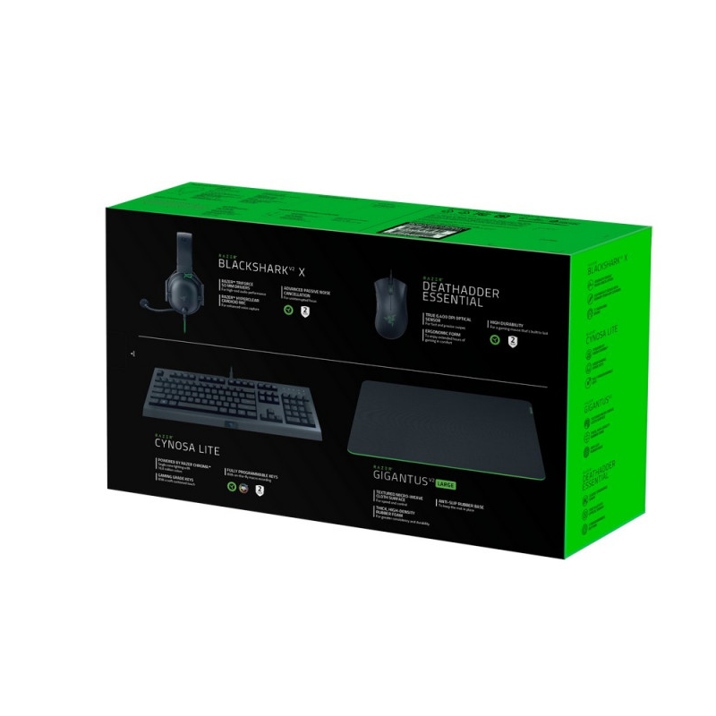 Ensemble clavier souris et casque de Razer. Contient les éléments suivants: Casque Razer Blackshark V2 X, Clavier de jeu Razer Cynosa Lite , Souris de jeu Razer DeathAdder Essential , tapis gigantus v2 large .