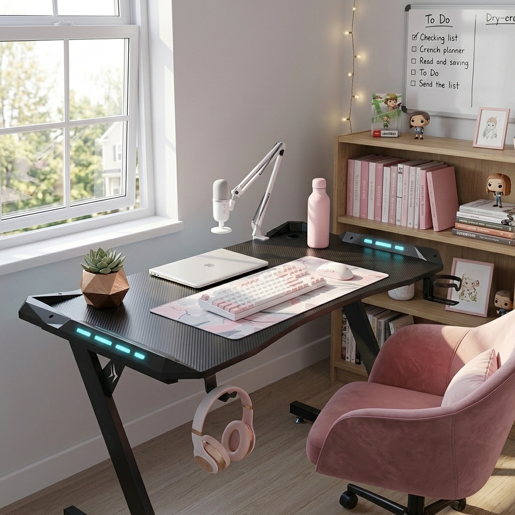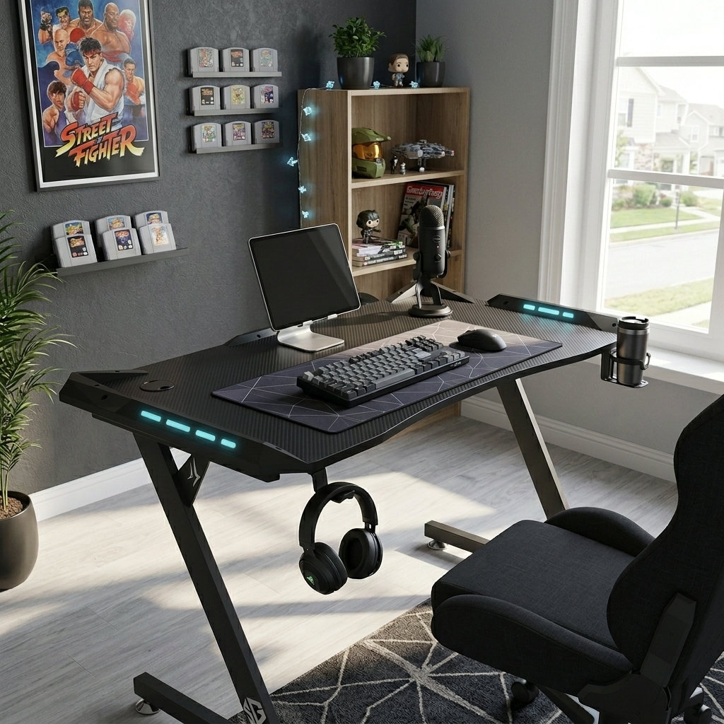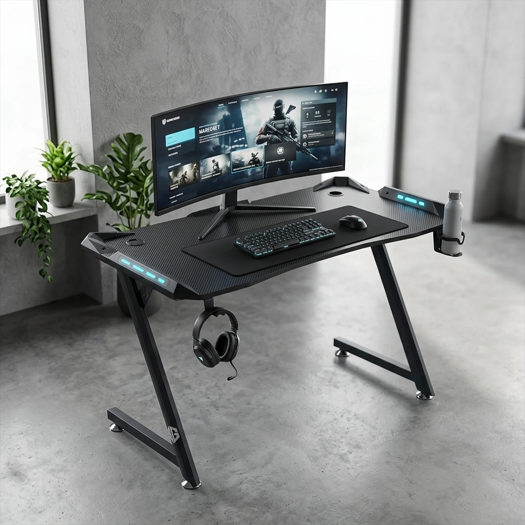 La surface est traitée avec un revêtement en fibre de carbone élégant, résistant aux rayures et offrant une glisse précise pour votre tapis de souris. Pour un setup toujours net, il intègre des solutions de gestion de câbles intelligentes, un support pour casque et un porte-gobelet dédié. Disponible dans notre gamme de bureaux gamer au Maroc, le modèle CARBONE Z est conçu pour les joueurs qui ne font aucun compromis sur la solidité et le look de leur espace de jeu.