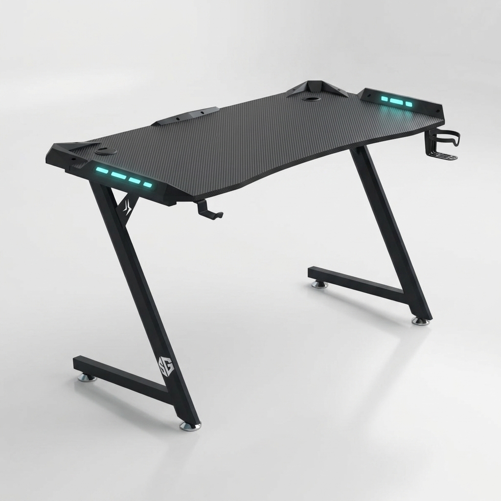 Bureau Gamer SG CARBONE Z Stabilité en Z incomparable, finition carbone premium et accessoires essentiels intégrés pour un setup organisé et stylé.