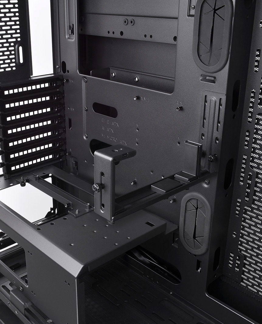 Le couvercle du bloc d’alimentation intégré est conçu pour cacher les câbles inesthétiques avec une bonne ventilation globale. Le support de câble Riser sur le dessus du couvercle du bloc d’alimentation et un support GPU supplémentaire en forme de L dans la boîte d’accessoires permettent non seulement l’installation verticale du GPU, mais aident à réduire le poids sur les emplacements PCI-E, en particulier lors de l’installation de cartes graphiques haut de gamme comme Série NVIDIA GEFORCE RTX et série AMD Radeon™ RX. De plus, le support GPU supplémentaire peut être utilisé pour maintenir des GPU placés verticalement et horizontalement et les utilisateurs peuvent installer le support de trois manières en fonction de leurs besoins.